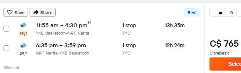 3. Search for a flight from Saskatoon (YXE) to Tokyo, Japan (NRT)